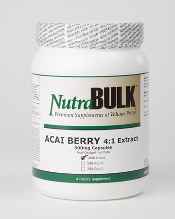 Acai berries are from an Amazon species of palm tree and have long been prized by Brazilian natives for their high nutritional content and ability to provide energy and a sense of strength and overall well being. Acai berries are packed with a variety of potent antioxidants and flavonoids. They are a source of high concentrations of essential fatty acids, omega 6&9 fatty acids, vitamins (especially B-complex and C) electrolytes and anthocyanins. As a supplement, the potent antioxidants and nutrients found in Acai Berries are thought to provide greater energy, assist with weight loss goals, purify and cleanse the body at the cellular of damaging free radicals and for its impact to slow the aging process. We take great care at NutraBulk in the selection and testing of the fresh, high quality Acai Berry 4:1 concentracted extract used in our Acai Berry 500mg Capsules. We only use the FRUIT of the ACAI BERRY and not the seeds and other parts of the plant that are often used as filler in lesser qaulity ACAI products. Were proud to be able to offer Acai Berry 4:1 500mg capsules of this potency and quality at our NutraBulk volume pricing.
